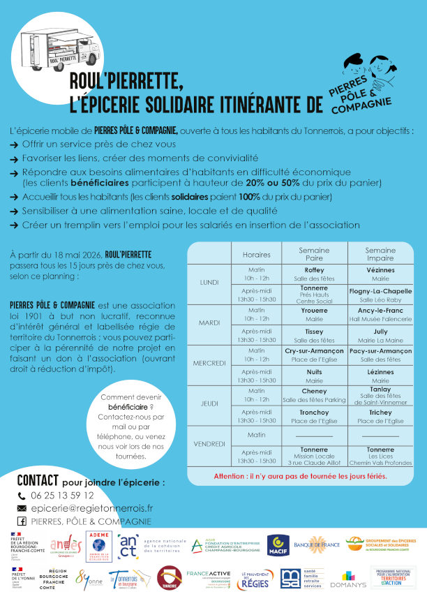– Pierres, Pôle & Compagnie à Tonnerre : postes à pourvoir : DEUX COORDONNATEURS OPERATIONNELS de l’EPICERIE SOCIALE ET SOLIDAIRE ITINERANTE Roul’Pierrette 5.03.26